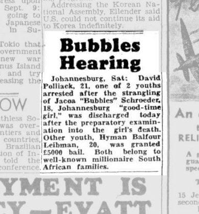 He, too, lived in Sea Point Place. One of South Africaβs strangest cold cases still sits in the shadows. In 1949, Jacoba βBubblesβ Schroeder was found dead in a plantation near the Wanderers Club in Illovo, Johannesburg. The newspapers of the day loved to label her, βgood-time girlβ, scandal figure, socialite, anything except what mattered, she had been murdered, and no one was ever held responsible.